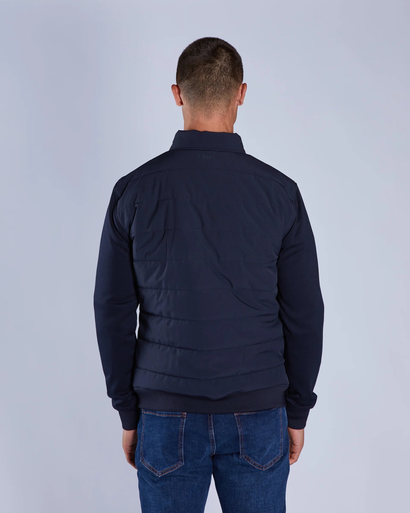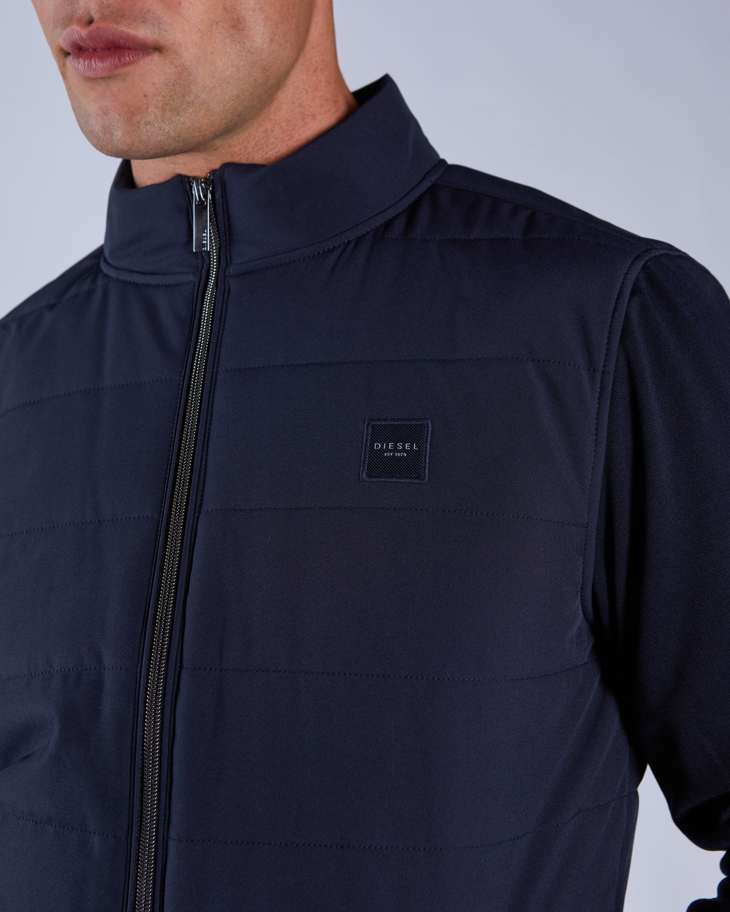 Men's hybrid jacket with quilted chest and stand collar. Soft, stretch sleeves and back panel, paired with ribbed cuffs and hem for comfort fit. It has our premium Diesel embroidered badge on chest.